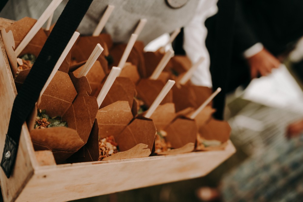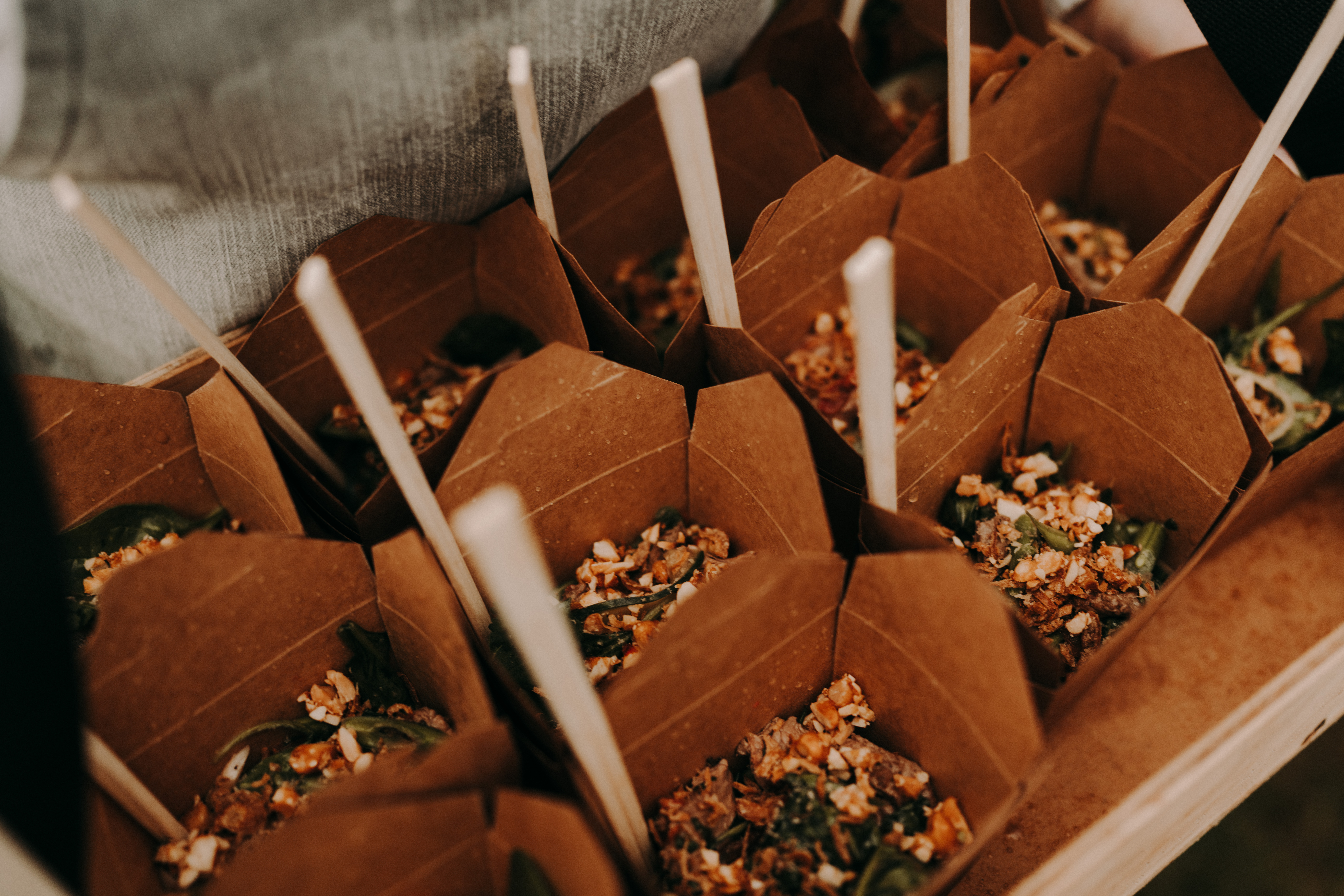 Noodle box with Thai beef salad with tomato, cucumber and chilli topped with coriander and peanuts
