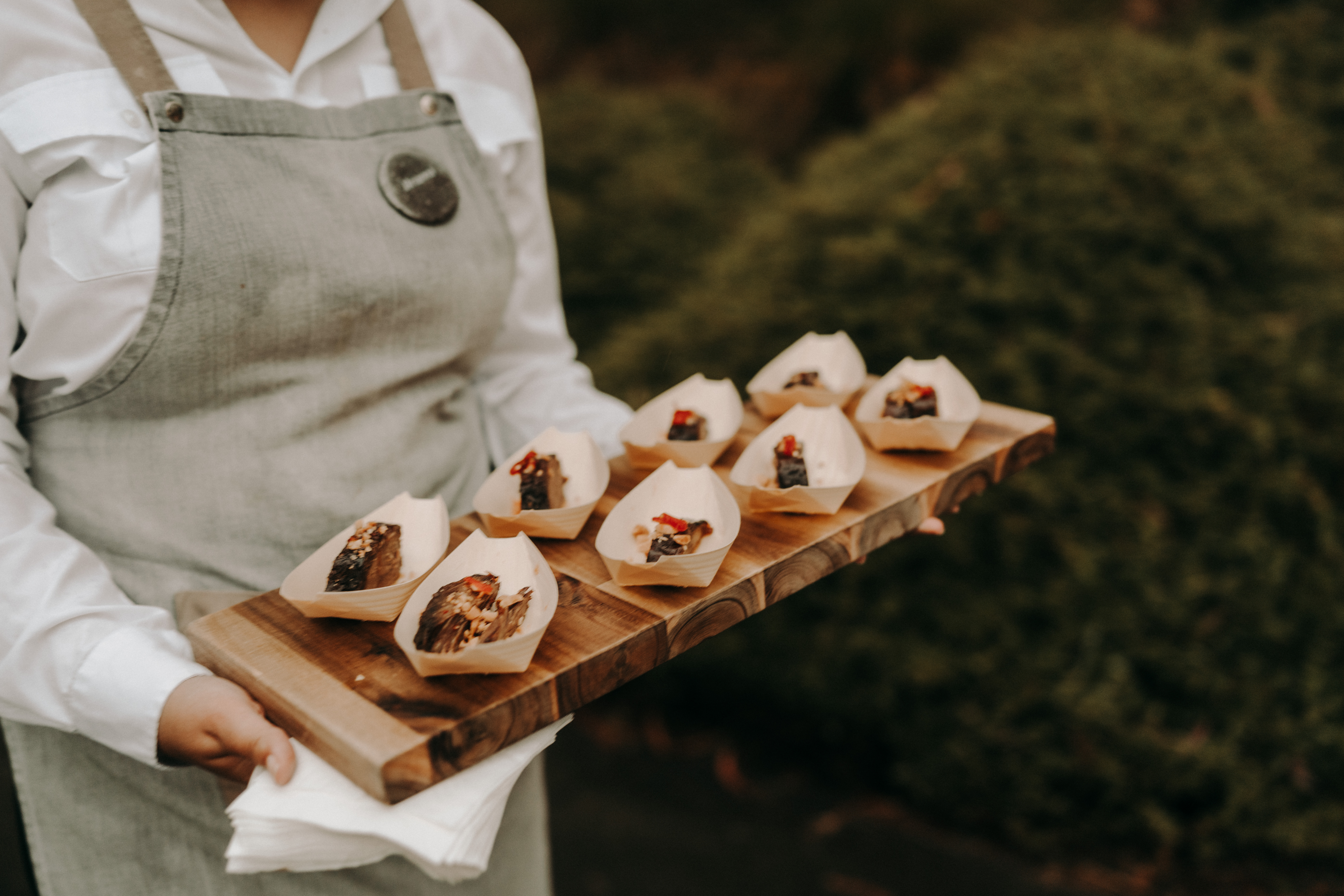 Balsa boat with chicken laab lettuce parcels with fried shallots and fresh herbs